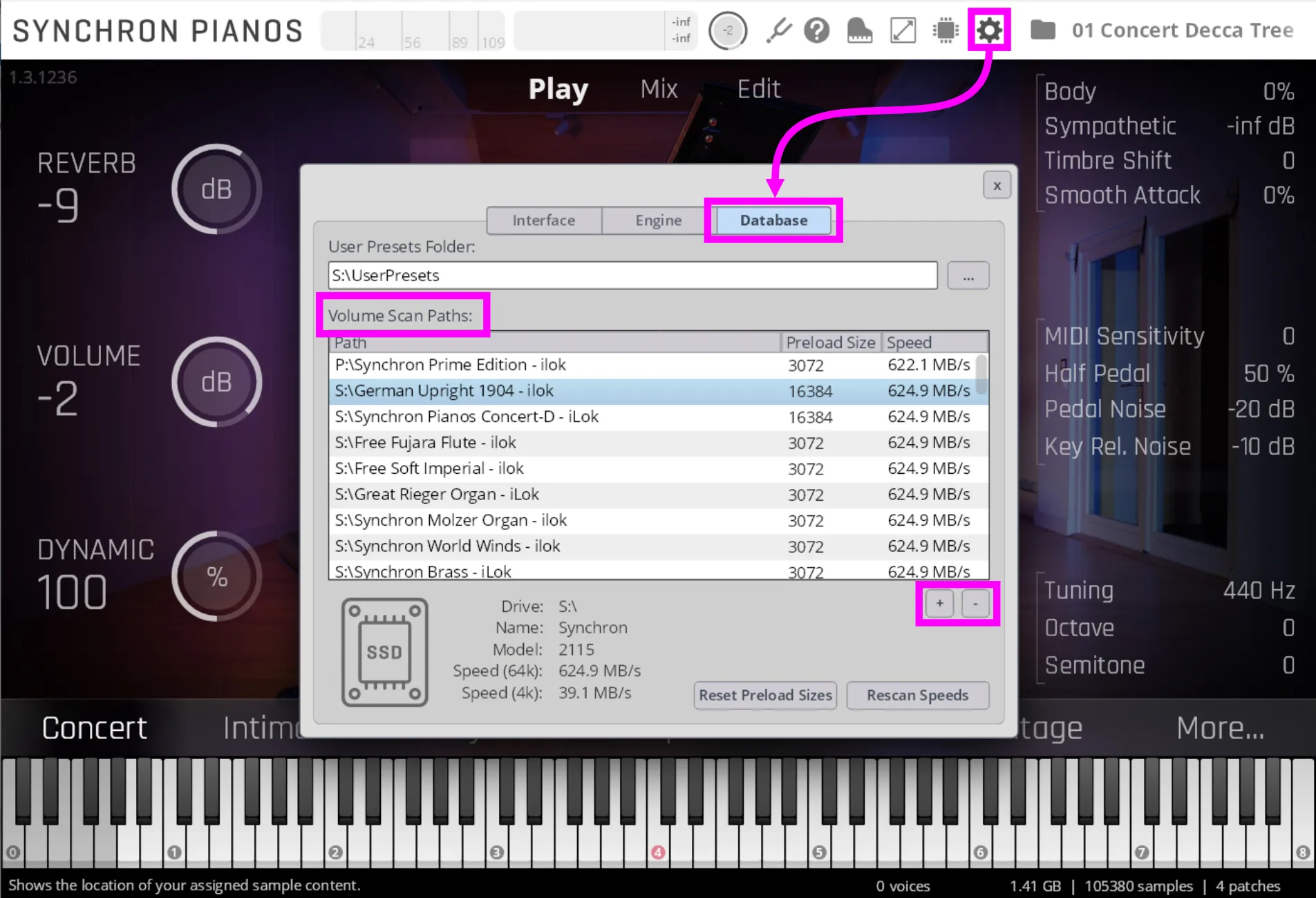 권장하지는 않지만, 왼쪽 하단의 + / − 버튼으로 샘플 볼륨의 스캔 경로를 추가하거나 제거할 수 있음. 이 설정을 바꾼 뒤에는 반드시 호스트 프로그램을 재시작해야 함.