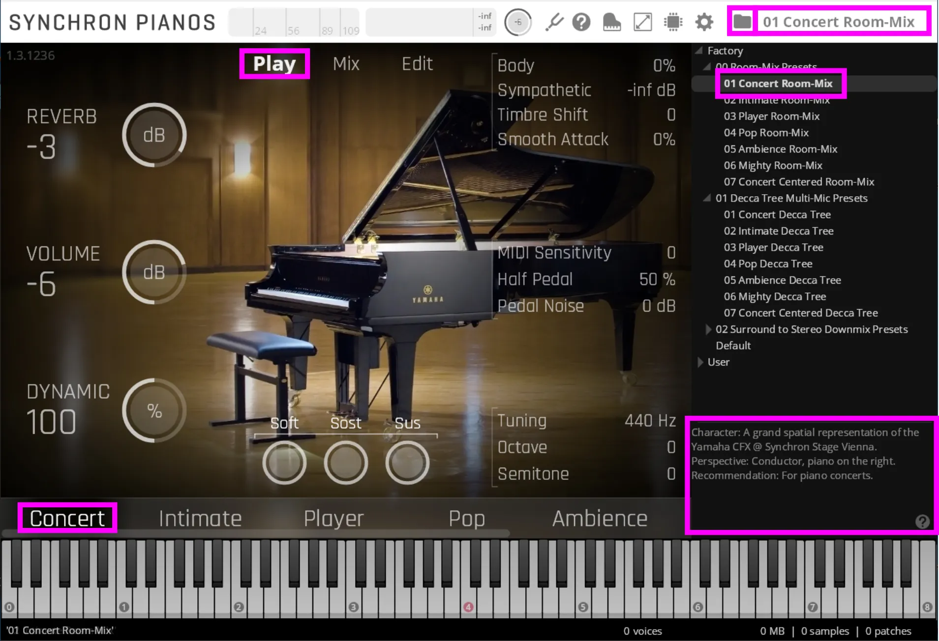콘서트 센터드 (야마하 CFX 전용) 콘서트 프리셋과 거의 동일하지만 피아노 위치를 중앙으로 옮긴 버전임. 이에 맞춰 EQ와 패닝을 조정했음. 야마하 CFX를 솔로로 연주할 때 적합함.