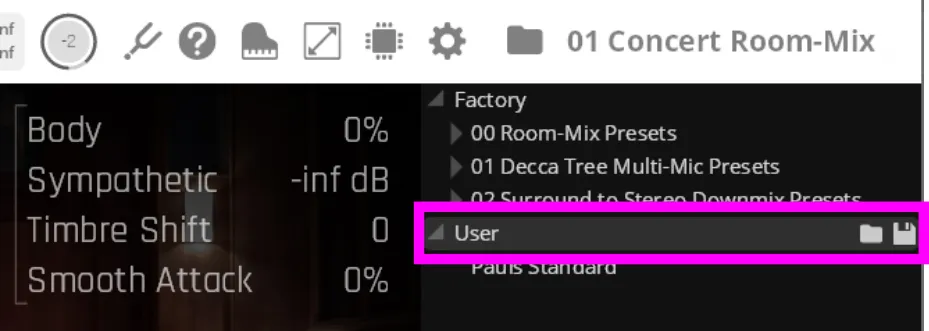 플레이 뷰에서 프리셋을 선택하면 시스템 부하가 적은 ‘룸 믹스(Room Mix)’ 프리셋이 함께 로드됨. 룸 믹스 채널은 풀 라이브러리에 포함된 여러 룸 마이크 신호를 미리 섞어 둔 것으로, 전체 공간감을 간편하게 조절할 수 있음.