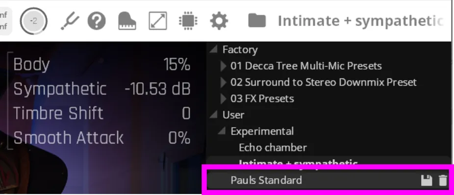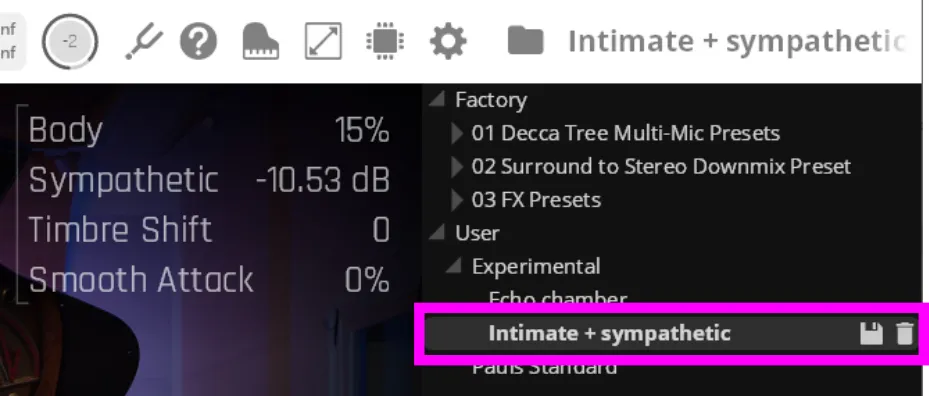 인티메이트 가까운 거리에서 연주를 듣는 느낌에 약간의 공간감을 더한 프리셋임. 친밀한 발라드나 강한 화음 연주에 잘 어울림. 청취 위치는 연주자 기준 중앙이며, 피아노 내부에서 울리는 듯한 몰입감 있는 소리가 특징임. 클로즈 마이크에는 리버브를 최소로 사용했고 고음역을 줄였음. 룸 마이크의 시간 지연은 크게 설정되어 있으며, 바디 레조넌스를 추가해 소리를 더 단단하게 만들었음.