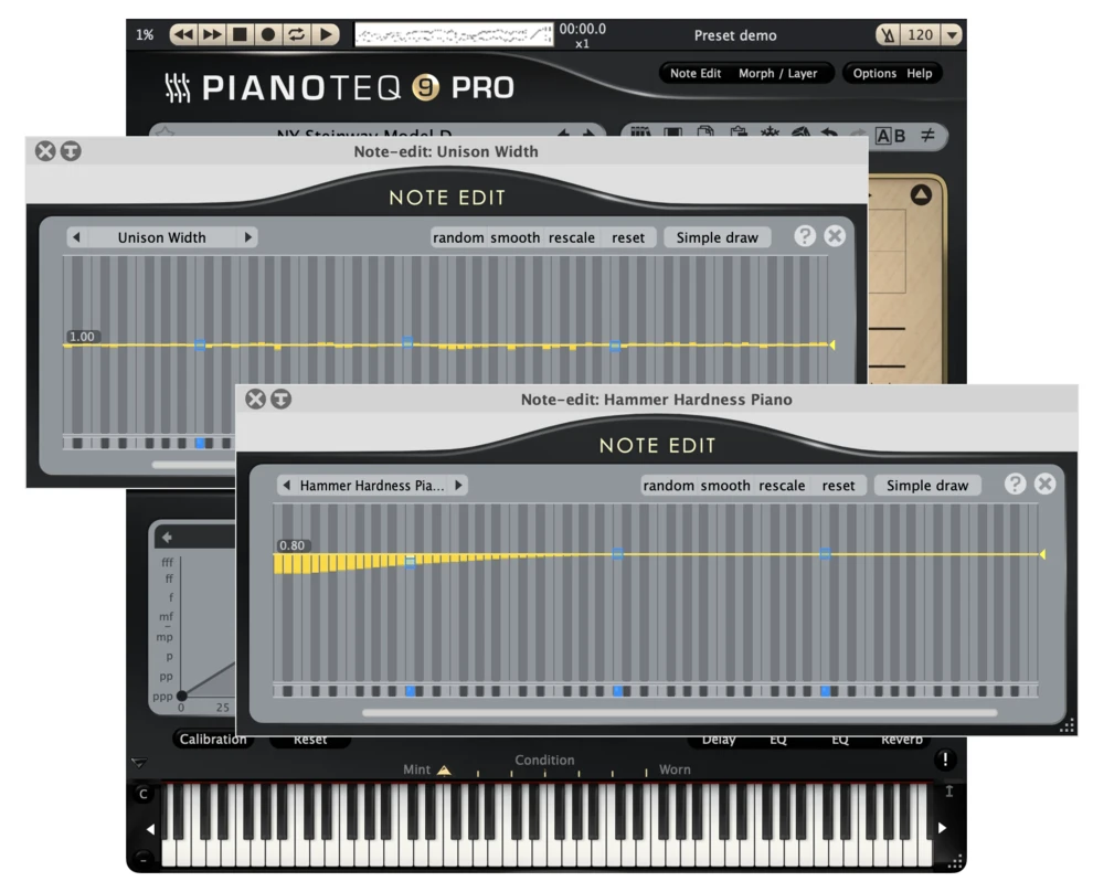 튜닝, 유니즌 폭, 해머 경도, 타현 위치, 현 길이, 스펙트럼 프로파일, 사운드보드 임피던스, 댐퍼 위치 등을 각 노트마다 개별적으로 설정할 수 있음.