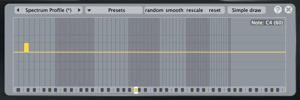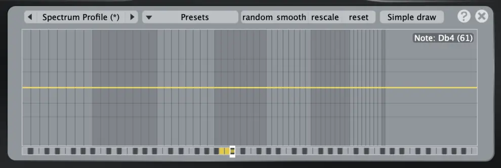 Harmonic, Comb, Major, Octave 같은 조합 모드가 있고, 값을 그리는 방식도 Simple draw, Haircut, Fill only처럼 나뉘어 있음. 이 설정들은 오른쪽 Simple draw라고 기본 선택된 메뉴에서 선택할 수 있음.