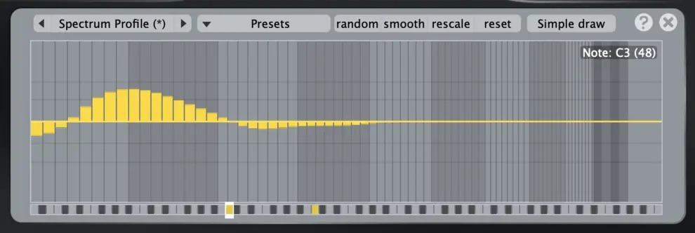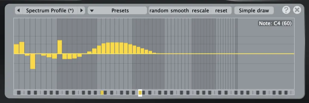 커브의 윤곽은 핸들로 조절하며, 이 핸들은 제어 노트에 붙어 있음. 제어 노트는 그래프 아래 컨트롤 레일을 더블 클릭해 추가하거나 삭제함. 한 번 만든 제어 노트 구조는 Spectrum profile을 제외한 모든 파라미터에 그대로 적용됨.