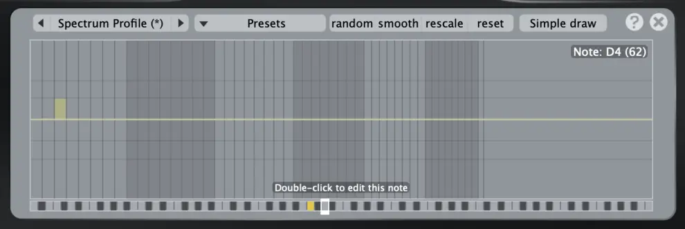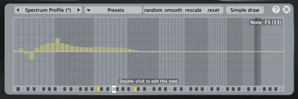 노트 에디트는 스펙트럼 프로파일에서 전체 음색을 만지지 않고 음별로 파라미터를 편집 할 수 있음. 편집하려는 스펙트럼 프로파일의 슬라이더 중 하나를 더블클릭하면 노트 에디트 화면이 열림.