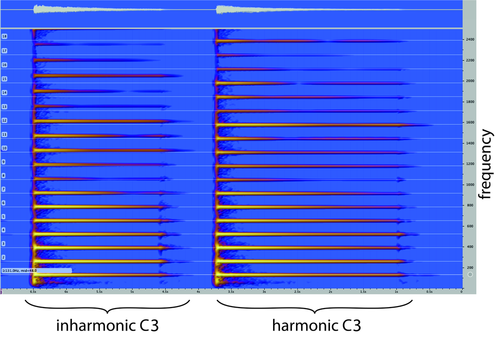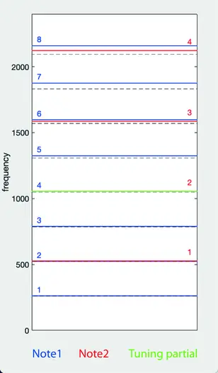 만약, C3–C4 옥타브를 정확한 2배 관계로 튜닝하면, 두 음 사이에 맥놀이가 발생하고, C4의 기본음은 C3의 2배음보다 낮아짐. 비조화성을 고려한 가장 쉬운 해결책은 C4의 기본음을 C3의 2배음에 맞추는 것인데, 이 경우 다른 배음 쌍의 정렬이 어긋남. 예를 들어 C3의 4배음은 C4의 2배음보다 높아짐.