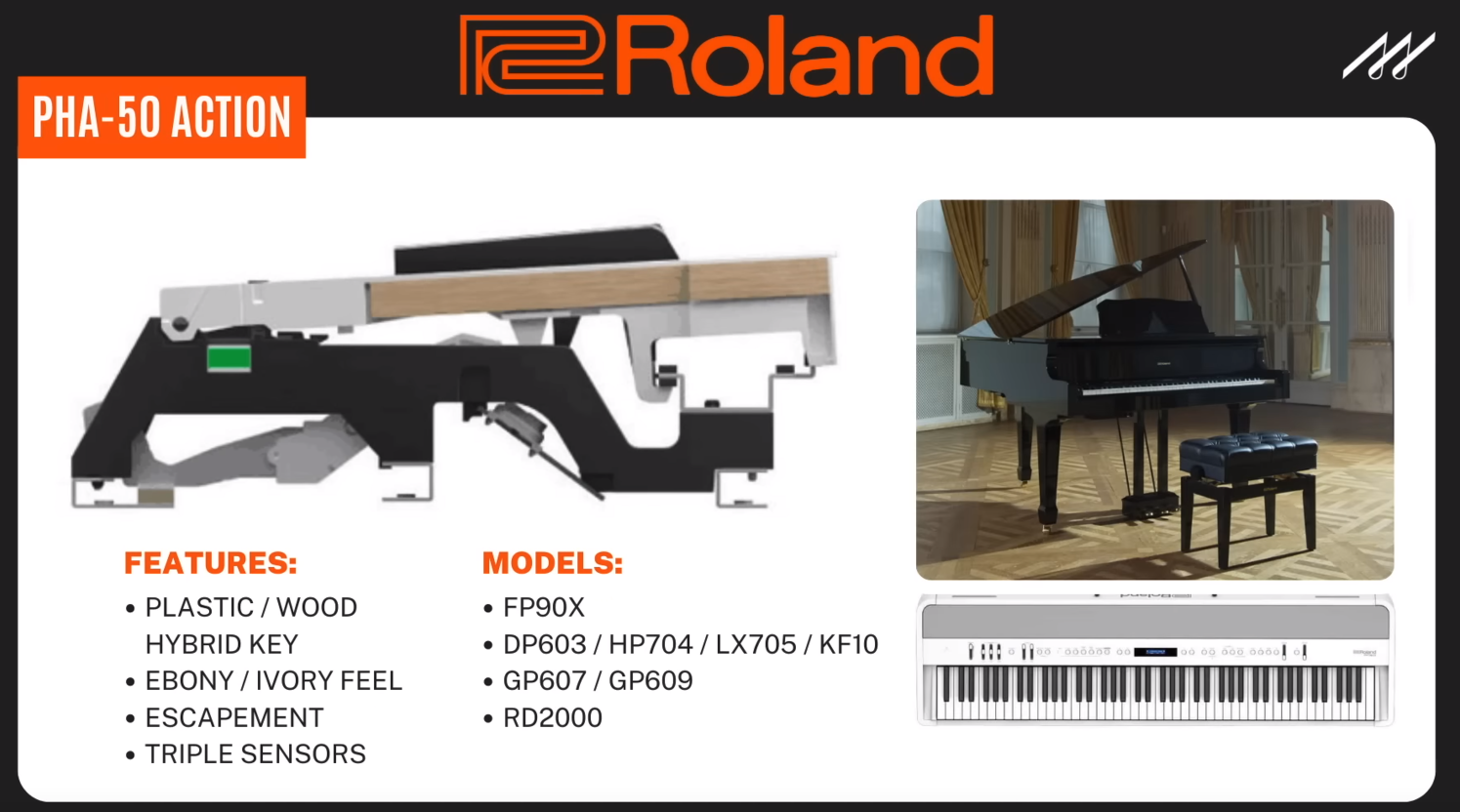 PHA-4보다 건반이 가볍고, 균형감과 피벗 길이, 응답성은 더 뛰어나 전체적으로 균형잡힌 타건감임. 표면은 인조 상아와 흑단 질감을 적용해 시각적으로나 촉각으로나 모두 상급기다운 마감임.