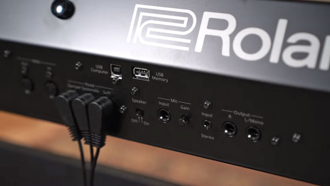 연결 단자는 MIDI In Out, 스테레오 라인 출력 6.3mm L Mono R, USB Computer Type B, USB Memory Type A, 오디오 입력 3.5mm, 헤드폰 단자 2개 6.3mm와 3.5mm, 마이크 입력 단자를 제공함. Bluetooth MIDI와 Bluetooth Audio도 지원함.