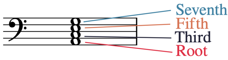 3화음과 마찬가지로 7화음도 맨 아래 음이 근음임. 나머지 음은 근음에서 몇 도 위인지에 따라 이름 붙임.